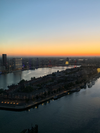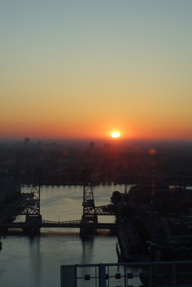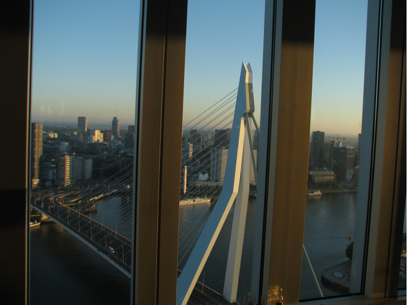 It was part of the 8-hours (**) DAWN-Trilogy in the Northsea Roundtown Festival (*) that took place at the 31th floor of DE ROTTERDAM office tower (designed by Rem Koolhaas) on the Wilhelmina pier above the 800-meter long iconic cable-stayed Erasmus Bridge (crossing the Meuse river) with its139-meter high. The high concert floor offered a grand 360’-degree panoramic view across the city, the river and the harbour. The concert initiated by the program-curator of North Sea Round Town Festival (*), Raluca Baicu, started at midnight and went in three parts until the 8:30 breakfast in the morning: WHITE MOON (2 hour solo by Belgian guitarist Bert Cools from Antwerp), BLUE HOUR (4 hour improvisation by Ensemble Ensemble) and GOLDEN LIGHT (2 hour concert of the trio of clarinetist Alex Simiu, trombonist Matthias Konrad and violinist/guitarist George Dumitriu (***) performing Simu’s score for Dutch movie “Beyond Sleep” (after the novel of Willem Frederik Hermans). It was an exceptional occasion to experience the urban ambience from such an extraordinary viewpoint through the night and the upcoming dawn with and through the emerging music.