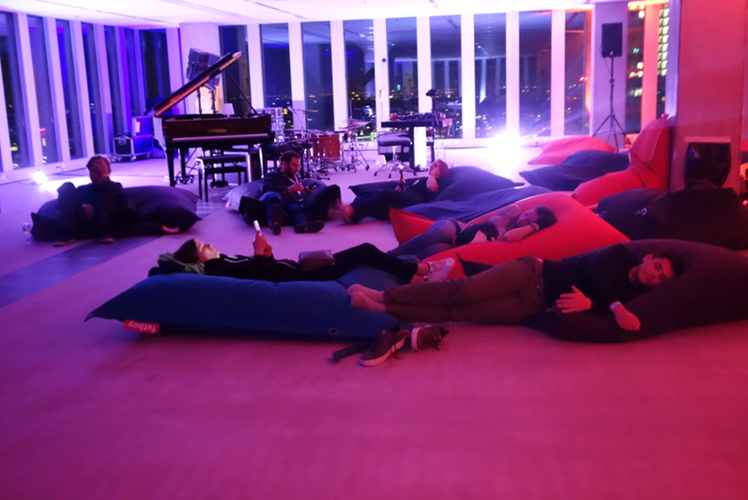 The Trilogy was an affair of little tunes emerging from far away and disappearing behind distant horizons, of playful particles wondrously floating and amalgamating in free improvisation, permeating and transforming the space of the 31st floor, enchanting and expanding the senses of the audience in an hours-long continuous stream. The improvised music generated significant sonic gestures and moments, which worked as a soundtrack for the surrounding real urban life at the gates of dawn. The building served as a relay between the ongoing music, the inner world of the audience members, and the sensations from the exterior, the urban activities and the shifting night—a real dream. The shifting light of the night sky and the gleaming and flickering urban lights tinged the experience of the music and the music intensified the experience of the night sky. The decision to attend was a decision to step out of one's own ordinary daily routine, not knowing if you will fall asleep, stay in a waking dream, enter a trance, or drop out after a while.