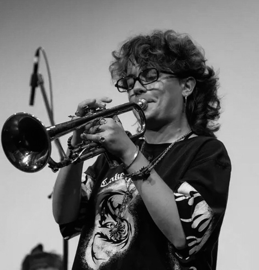 Portret van een jonge trompettiste en violiste in volle artistieke bloei.
