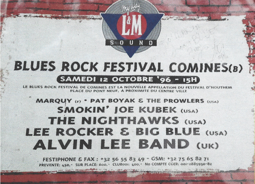 De bakker, de beenhouwer, de café-uitbaters van het dorp en ook vrienden van Komen, Waasten, Ploegsteert, Comines-France … maakten deel uit van het comité en ze waren amateur van de blues. Blues is een gemakkelijker genre dan jazz. Dus de markt was te klein en we hebben eind juli, met de voetbalploeg van Houthem, een tent op hun voetbalplein geplaatst. We moesten wachten tot de voetbalcompetitie ten einde was. En van bij het eerste jaar, in 1990, tot het einde in 1997, organiseerden wij een blues festival met een mooie affiche. Zo stonden Robben Ford, Rufus Thomas, Albatros, The Night Hawks, Anson Funderburgh, Alvin Lee, … op ons podium.