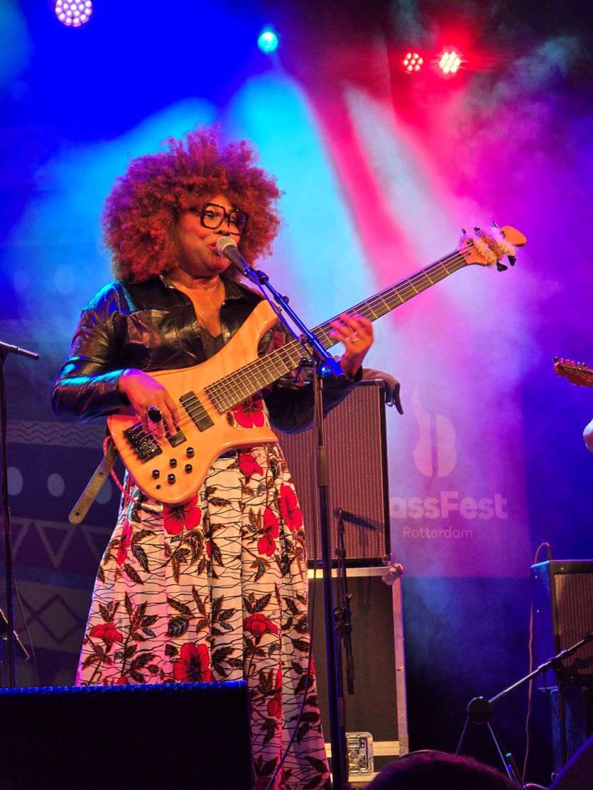 Manou Gallo speelt op een 5-snarige Windmill bas, gebouwd door Adrian Maruszczyk