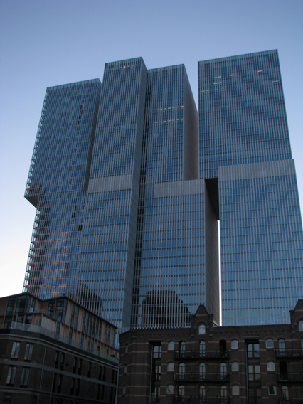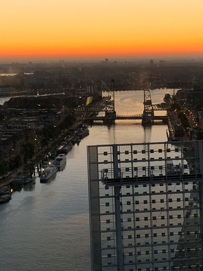 It was part of the 8-hours (**) DAWN-Trilogy in the Northsea Roundtown Festival (*) that took place at the 31th floor of DE ROTTERDAM office tower (designed by Rem Koolhaas) on the Wilhelmina pier above the 800-meter long iconic cable-stayed Erasmus Bridge (crossing the Meuse river) with its139-meter high. The high concert floor offered a grand 360’-degree panoramic view across the city, the river and the harbour. The concert initiated by the program-curator of North Sea Round Town Festival (*), Raluca Baicu, started at midnight and went in three parts until the 8:30 breakfast in the morning: WHITE MOON (2 hour solo by Belgian guitarist Bert Cools from Antwerp), BLUE HOUR (4 hour improvisation by Ensemble Ensemble) and GOLDEN LIGHT (2 hour concert of the trio of clarinetist Alex Simiu, trombonist Matthias Konrad and violinist/guitarist George Dumitriu (***) performing Simu’s score for Dutch movie “Beyond Sleep” (after the novel of Willem Frederik Hermans). It was an exceptional occasion to experience the urban ambience from such an extraordinary viewpoint through the night and the upcoming dawn with and through the emerging music.