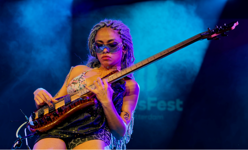 In tegenstelling met de voorgaande twee bands stond de Indische Mohini Dey met een minimale bezetting van keyboard, sax en drums op de planken. En zijzelf natuurlijk, manisch virtuoos slappend op haar 5-string design bassen.