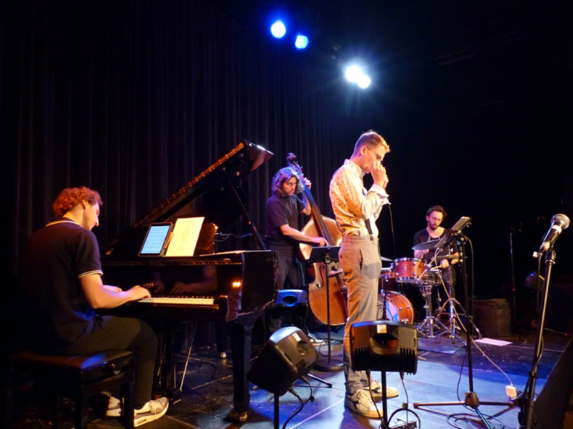 De veelzijdige meestercontrabassist Janos Bruneel verving Zjef Van Steenbergen op meesterlijke wijze. Al vlug zetten drummer Tom Peeters en pianist Elias D’Hooge “Swimpulse” (een compositie van D’hooge) swingend verder. Heerlijk hoe coherent er gemusiceerd werd.