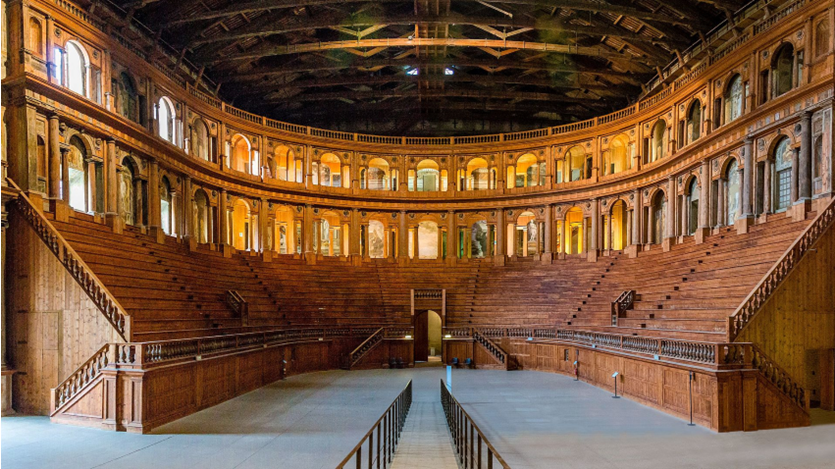 Teatro Farnese is a Renaissance theatre built from 1618 on as part of the Palazzo della Pilotta of the Parma and Piacenza Dukal family Farnese. It is an imposing space in the form of an amphitheatre with good acoustics. In the glorious past, the playing field for boat racing could even be submerged. HERE and HERE you can read about the turbulent construction history and ways of its usage through the centuries.