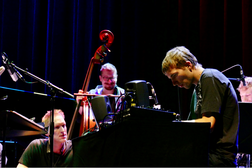 Then the heavily manoeuvring ensemble “Deranged {Particles” of Berlin bassist Felix Henkelhausen entered the scenery with six first class musicians on board: Percy Pursglove (tr), Philipp Gropper (ts), Evi Filippou (vibraphone, marimba), Valentin Gerhardus (sampling, electro), Elias Stemeseder (p, harpsichord, synth), Felix Henkelhausen (b, comp), Philip Dornbusch (perc)