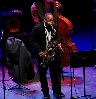 Core act of Friday evening in the Festspielhaus was veteran David Murray’s Quartet with three strong younger musicians, namely Marta Sanchez (p), Luke Stewart (b) and Russell Carter (dr) colouring the music in a strong and fine way while Murray maintained recognised by his muscular tone on tenor saxophone and darker streaks on bass clarinet. As speciality Murray offered his ‘birdsongs’ based on and accompanied by poems of his wife Francesca Cinelli.