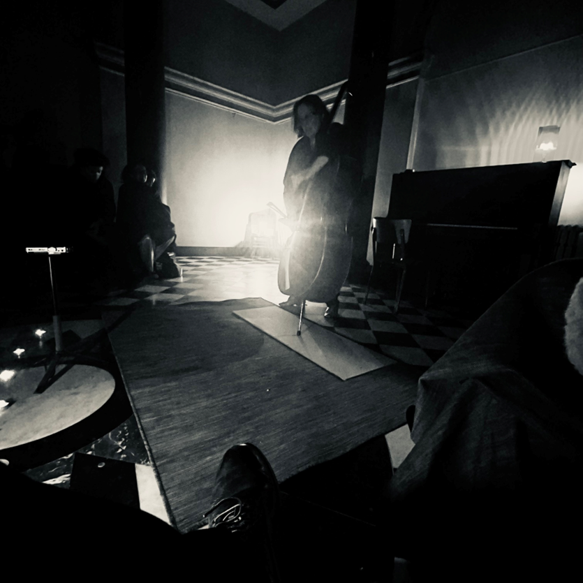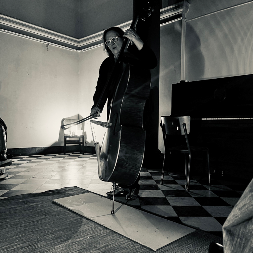 Op vrijdag 24 oktober 2025, in het Grand Hospice in Brussel, in de koude en nauwelijks verlichte kapel, zit een talrijk opgekomen publiek dicht opeen op banken rond een tapijt op de grond, waarop een prachtige contrabas ligt. Het is die van Joëlle Léandre.